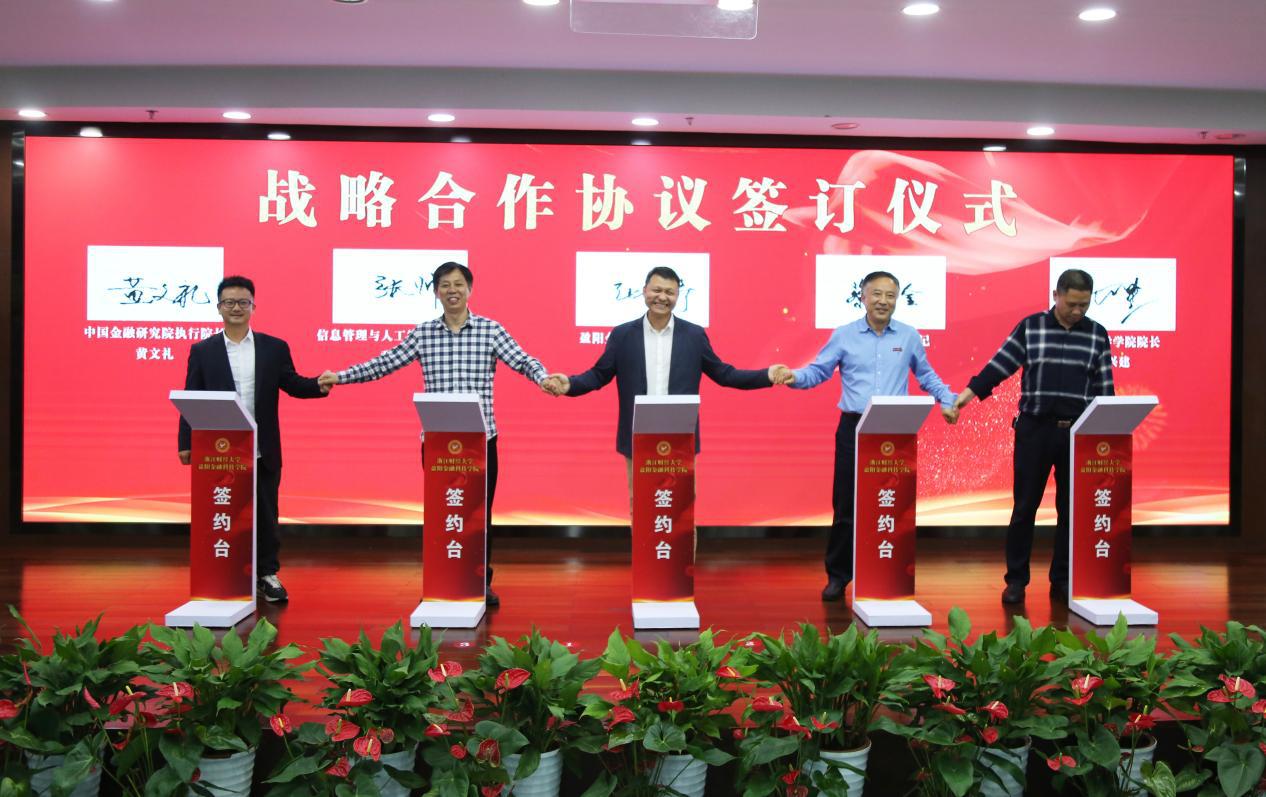 张文宇与金融学院党委书记蔡国金、信息管理与人工智能学院院长张帅、数据科学学院院长洪兴建和中国金融研究院执行院长黄文礼共同签订了战略合作协议。