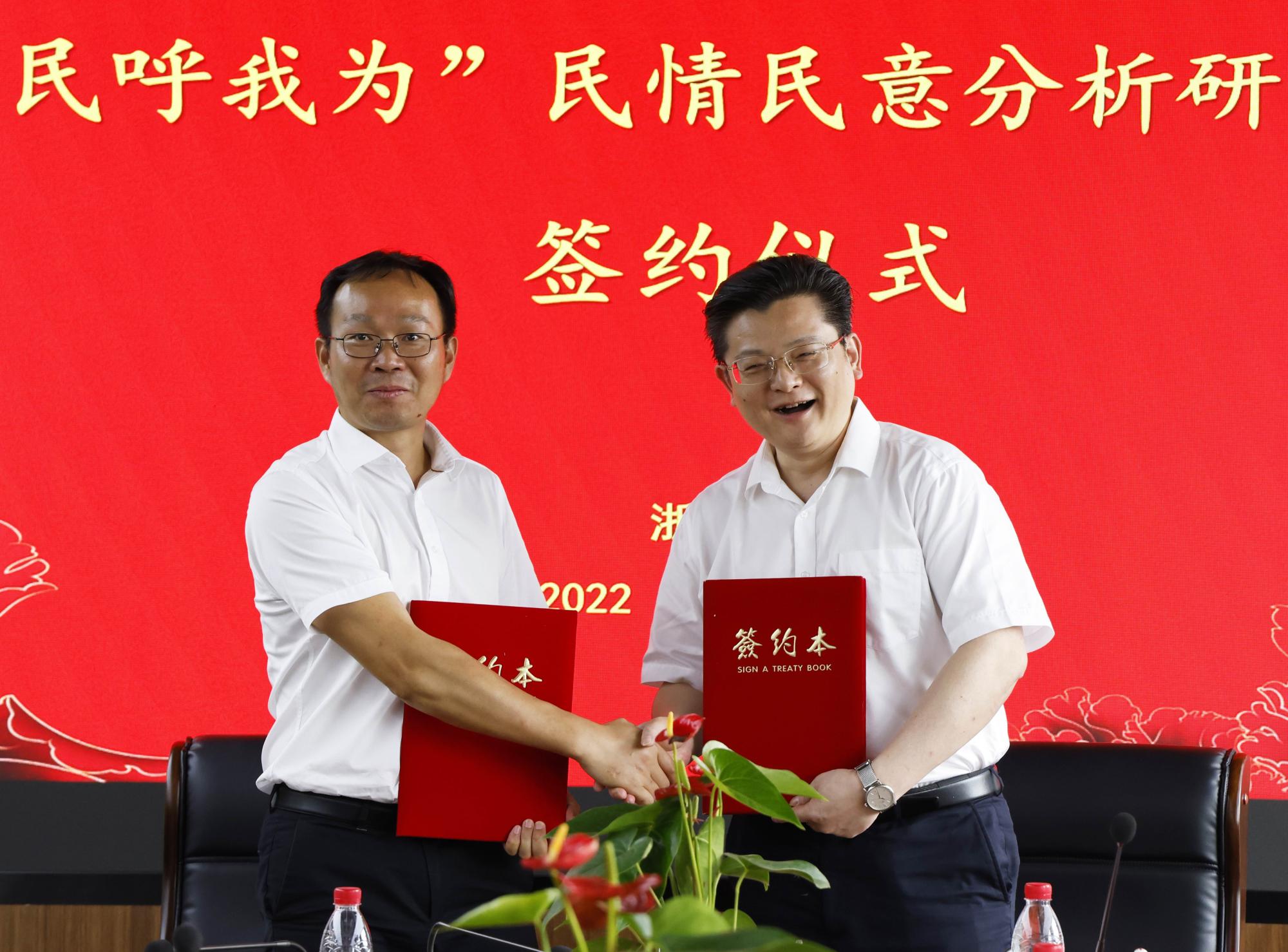 本网讯 6月10日,“民呼我为”民情民意分析研究项目签约暨杭州市“民呼我为”民情研析基地揭牌仪式在我校下沙校区举行。杭州市委副秘书长、市信访局局长周徐胤,市信访局副局长倪毅,副校长李占荣,校党委委员,组织部、宣传部、统战部部长楼胆群及市信访局相关处室和学校相关职能部门、学院、研究院负责人等出席仪式。