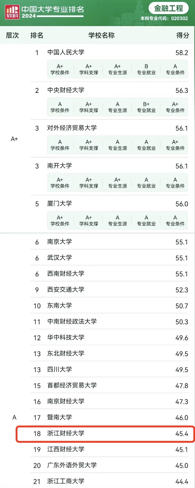 金融科技与金融工程两个招生专业均获评A层次(分别位列11名、18名),这一成绩充分肯定了学院在专业领域的教学实力和科研水平。