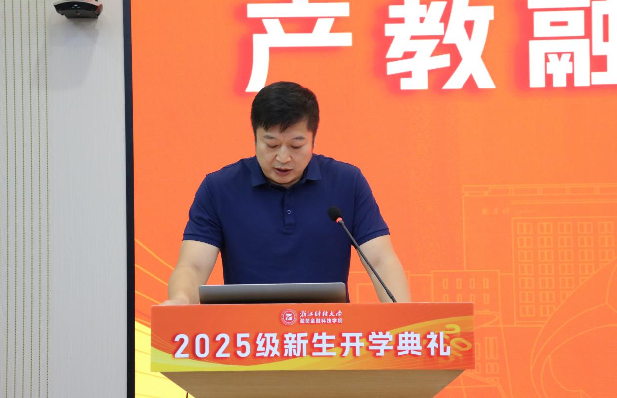 2025级新生代表裘哲文同学强调了科技与金融融合的重要性,呼吁全体新生以扎实学识和坚定信念,成为懂金融、通科技、有担当的新时代人才,共同推动金融科技教育改革与经济社会发展。