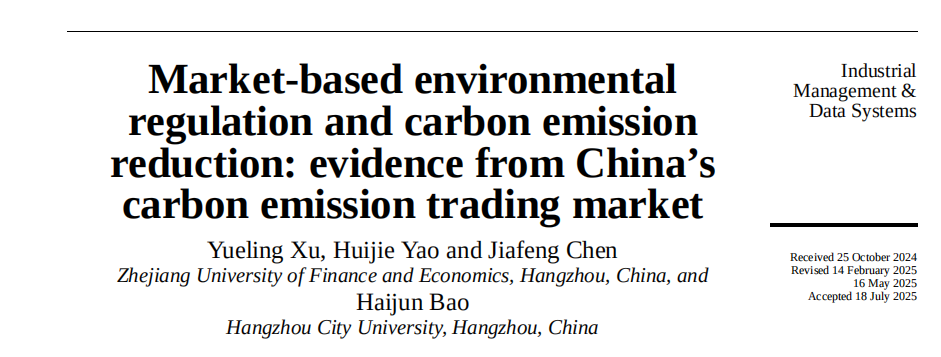 22级金融数学2班本科生姚慧杰同学在许跃龄老师指导下撰写的论文《Market-Based Environmental Regulation and Carbon Emission Reduction: Evidence from China’s Carbon Emission Trading Market》,正式发表于跨学科领域国际学术期刊《Industry Management & Data System》。该期刊为SCI Q2分区,同时也是我校认定的外文一级B类期刊。这是微密猫