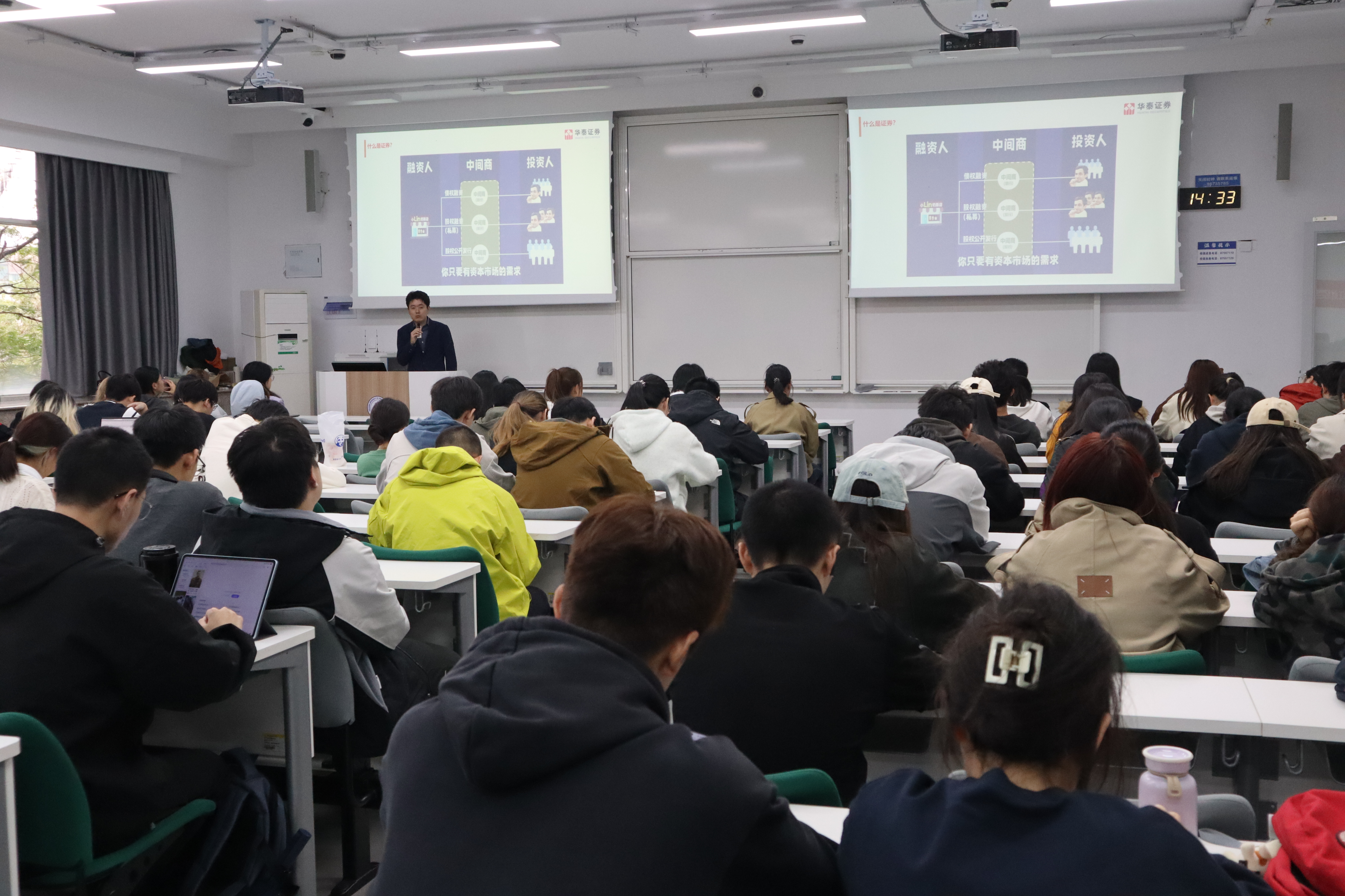 邀请了华泰证券杭州学院路证券营业部副总经理鲍文畅、合规法律部方奕,分别进行了主题为“证券行业介绍”和“开学季反洗钱特辑”的专题讲座。