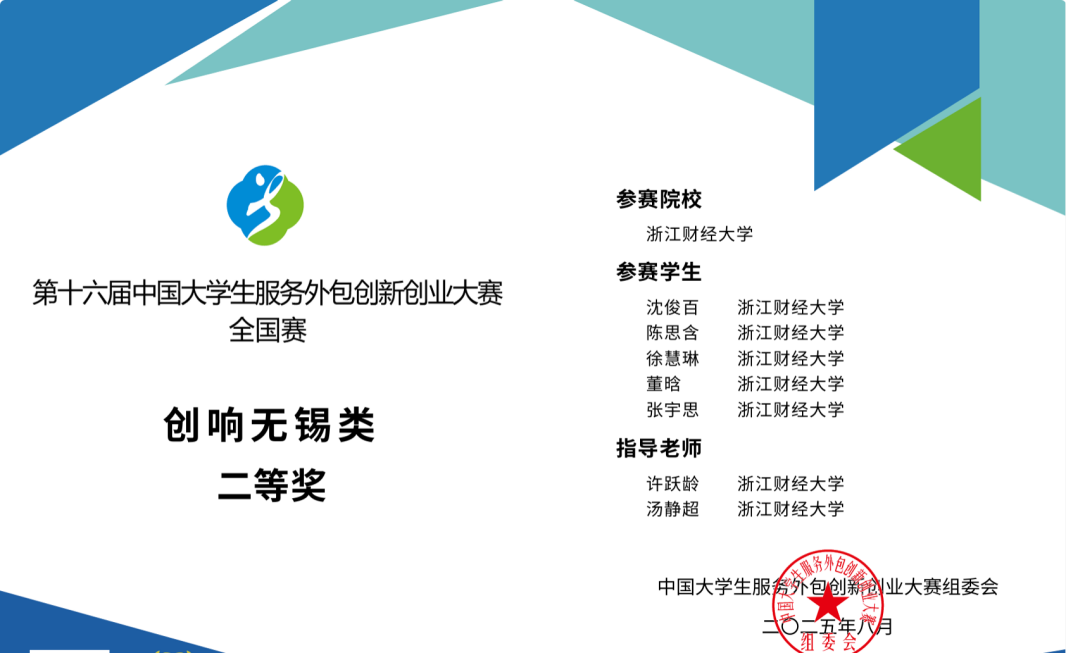 参赛团队项目《智金视界——中国传统黄金企业数字化转型的开拓者》在创响无锡类赛道中表现出色,斩获全国二等奖!刷新学院在该赛事全国总决赛中的历史最佳成绩。