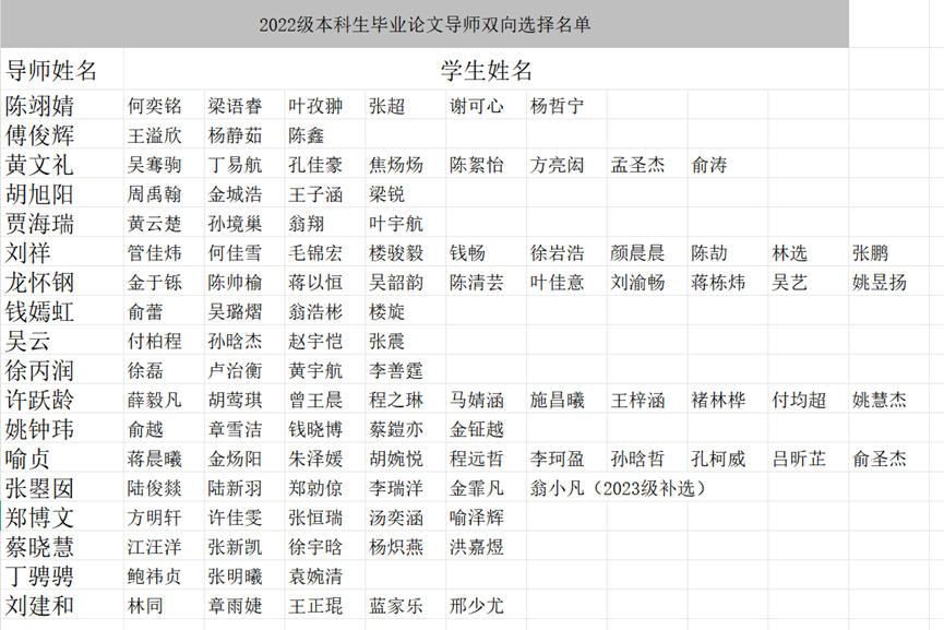 经2022级本科生、毕业论文导师双向选择以及学院综合协调,2022级本科生毕业论文导师的具体名单现公布如下。请各位同学在本名单公布一周内主动与导师联系,以便相关指导工作的顺利开展。
