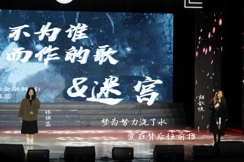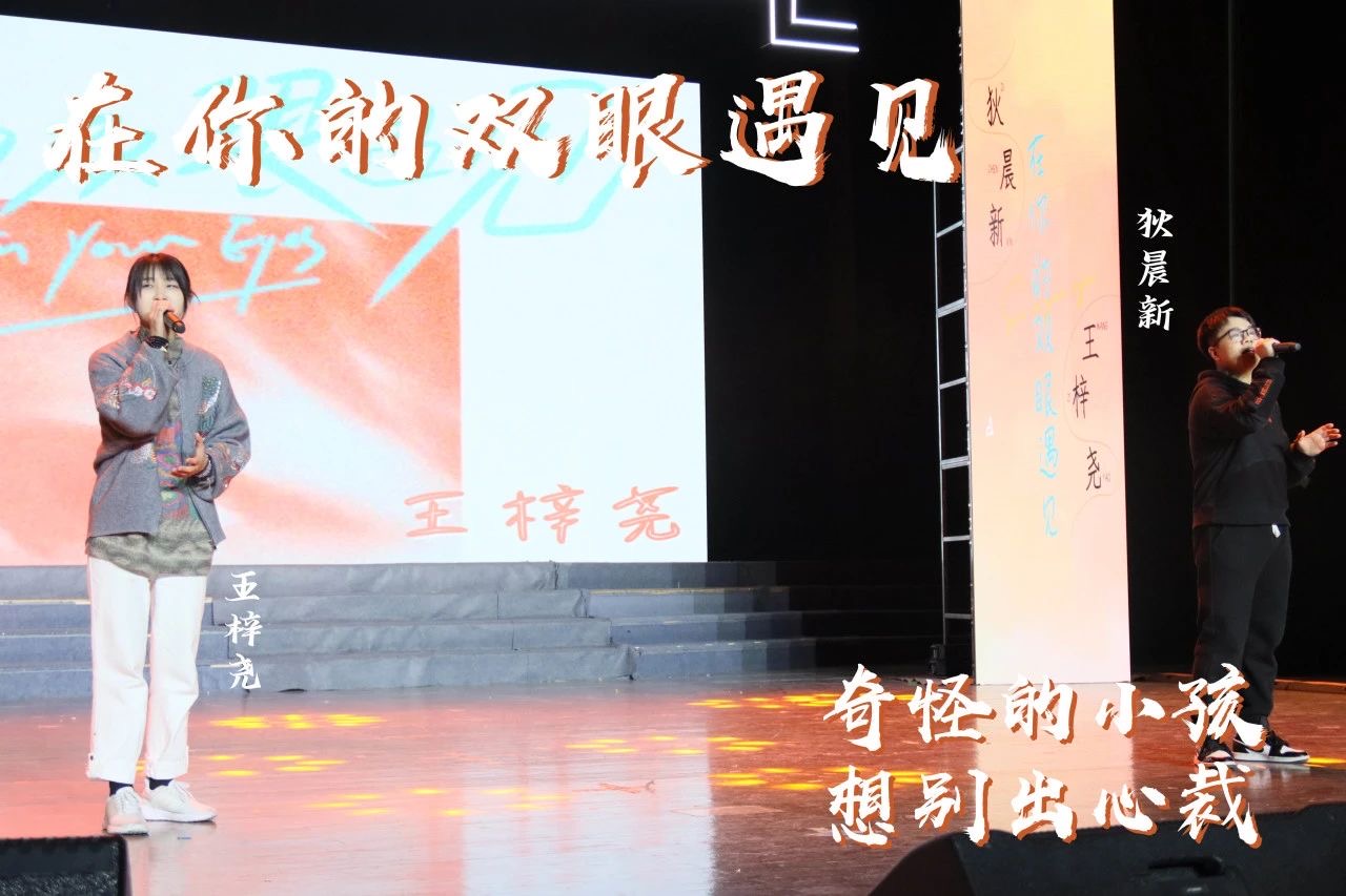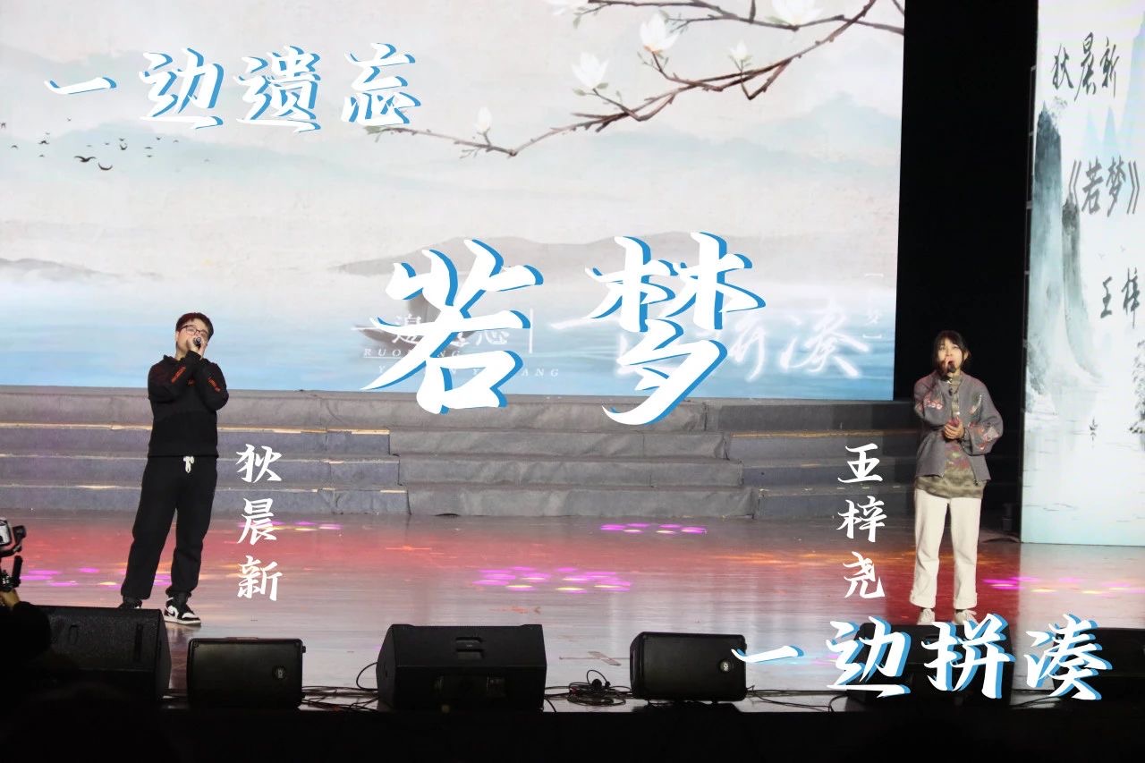 两届校“十佳歌手”冠军狄晨新和王梓尧为大家带来了歌曲对唱,一首《在你的双眼遇见》告诉心怀梦想的青年人坚持自己,一往无前。一首《若梦》深情演唱,“一边遗忘,一边拼凑”破碎之感涌上心头。