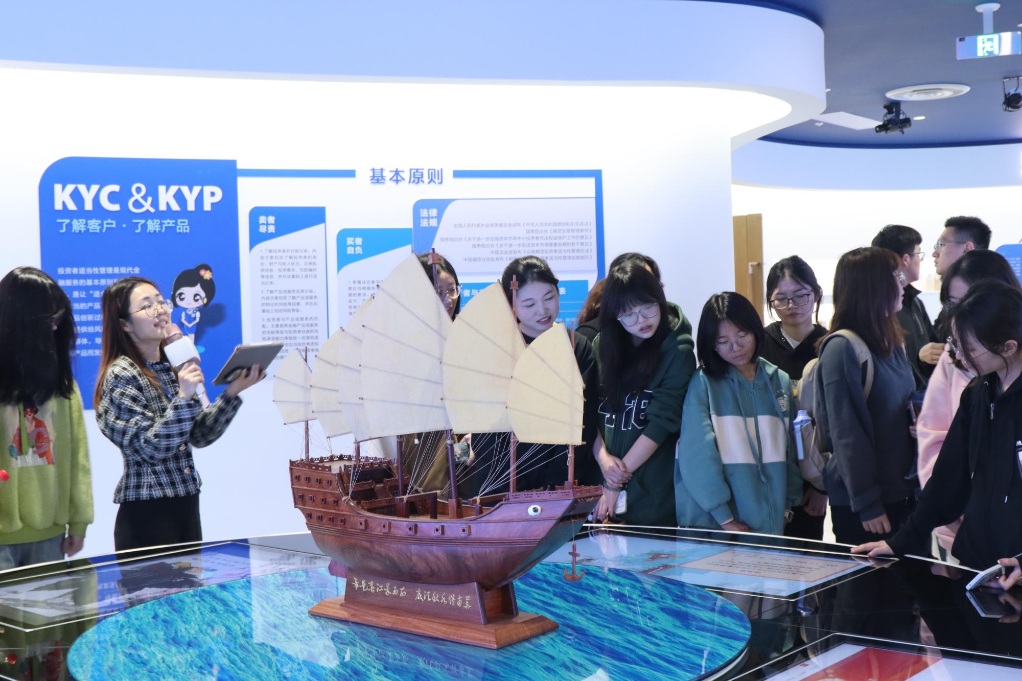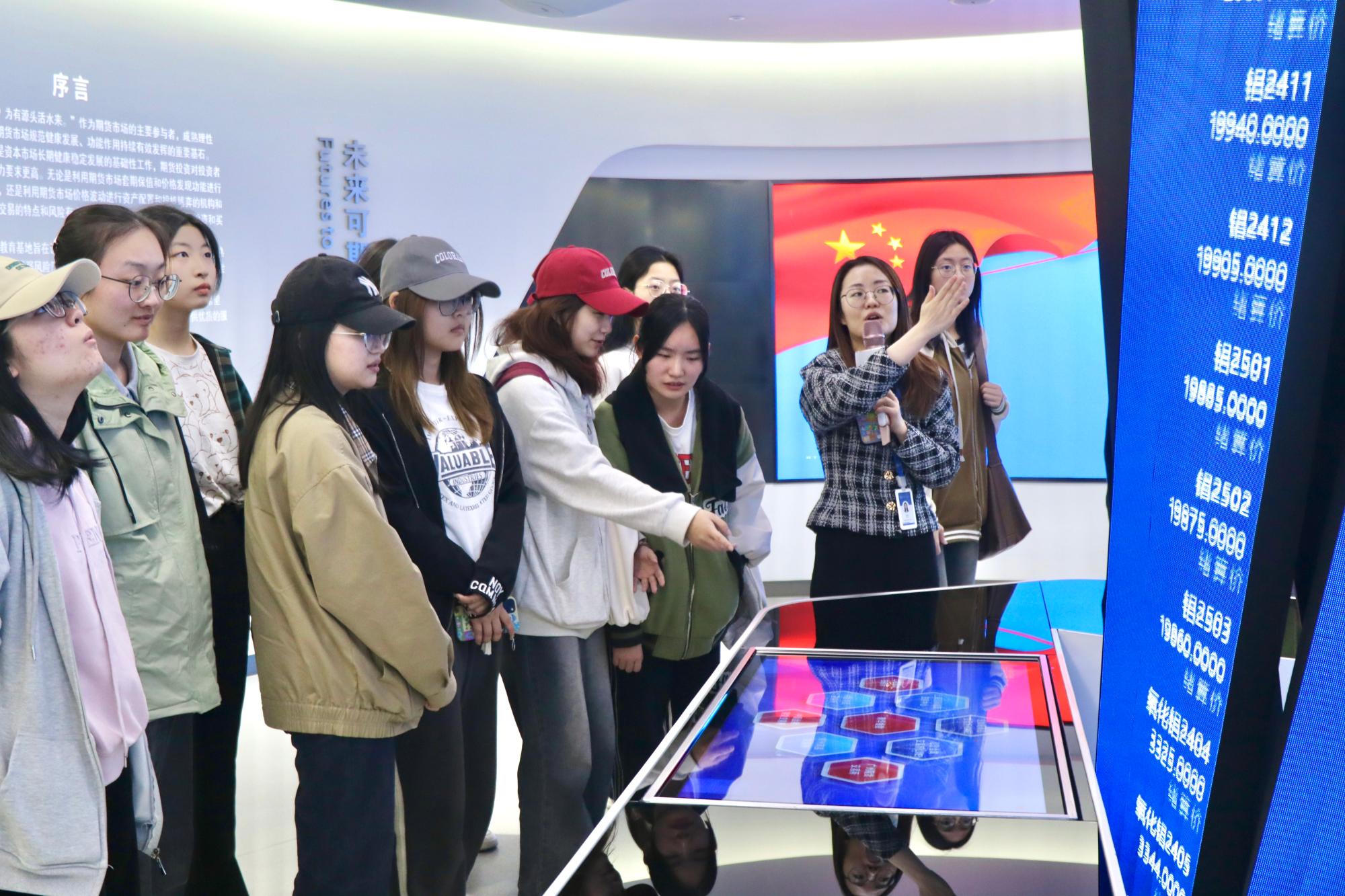 南华期货讲解员带领同学们参观了南华期货投资者教育基地,了解南华期货的微密猫与其紧跟中国期货行业的发展历程,在多元化的互动交流中对期货交易产生初步印象。